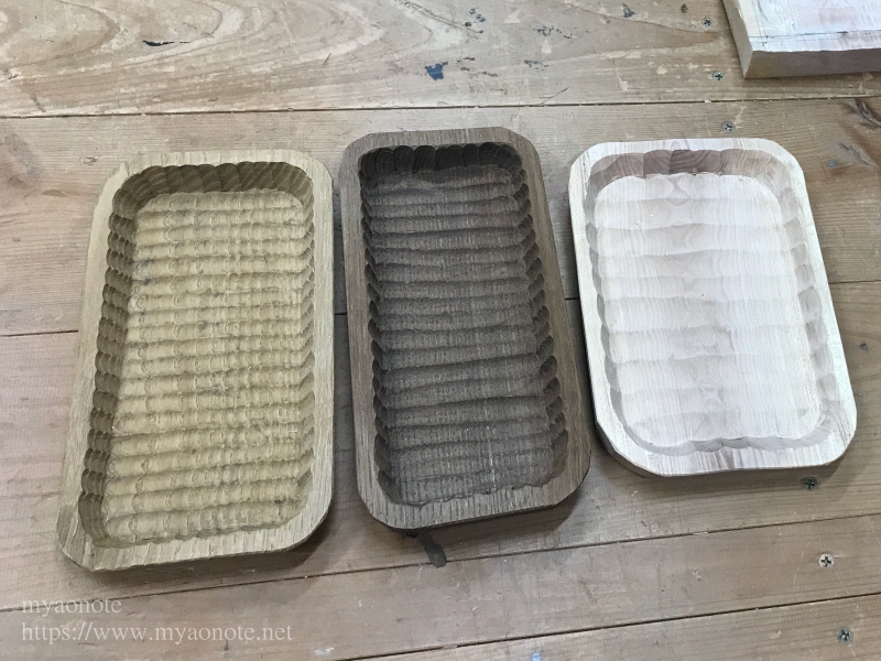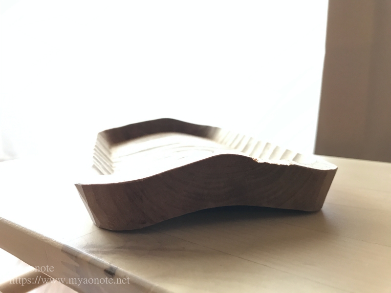 お盆の底を彫っていきます。縁となる部分に切り込みを入れて、溝をノミで彫る。少しずつ少しずつ、彫り進めて底を作っていきます。彫り出す時は、表面が凸凹してるから、なんだかノミがうまいこと進まず…。でも彫り進めるうちに、無心になる!これは楽しい作業でした。削るごとにジワッと水分が出てきたりして、生木を扱っているという不思議さを実感。