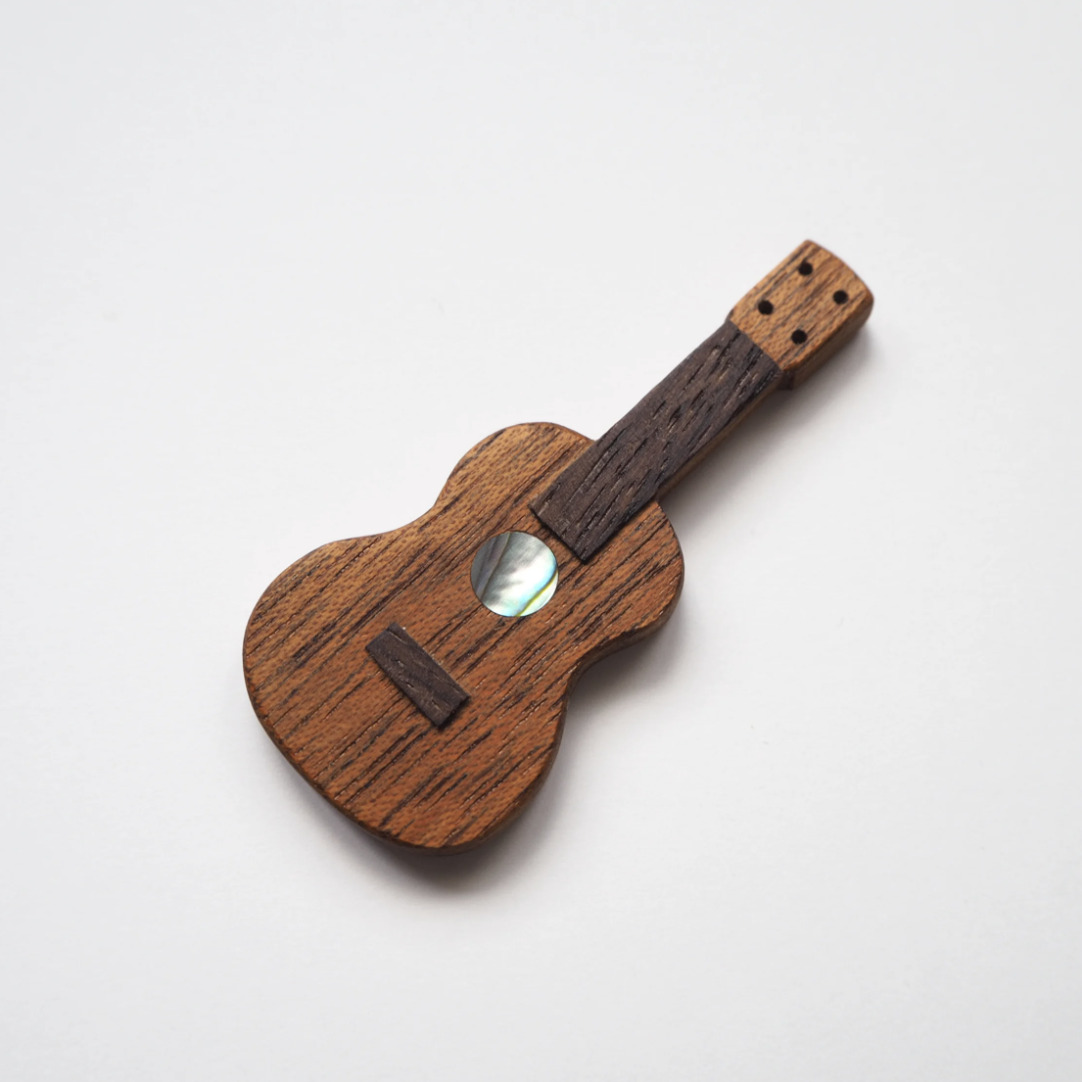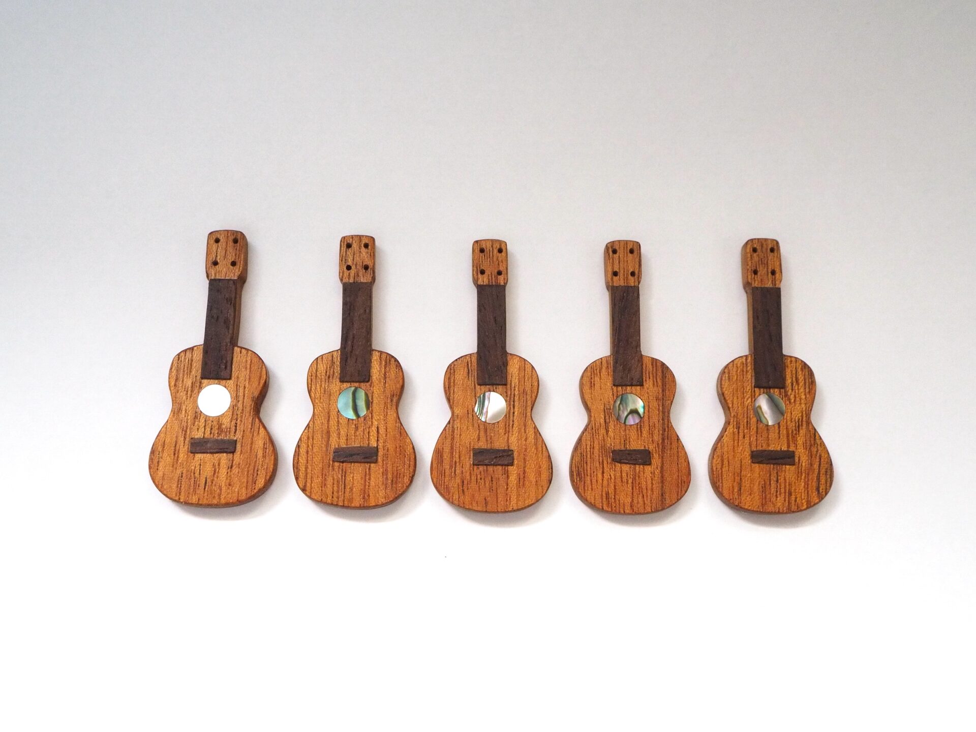 ギターやウクレレに実際に使われる銘木や貝を使用したこだわりの逸品です。